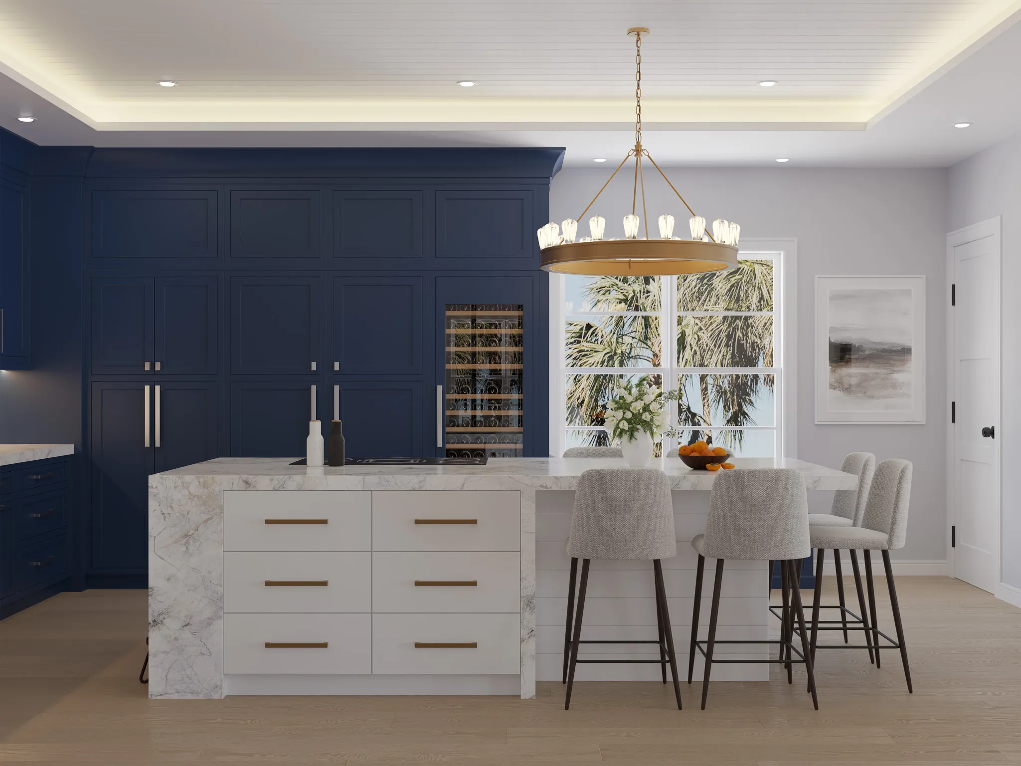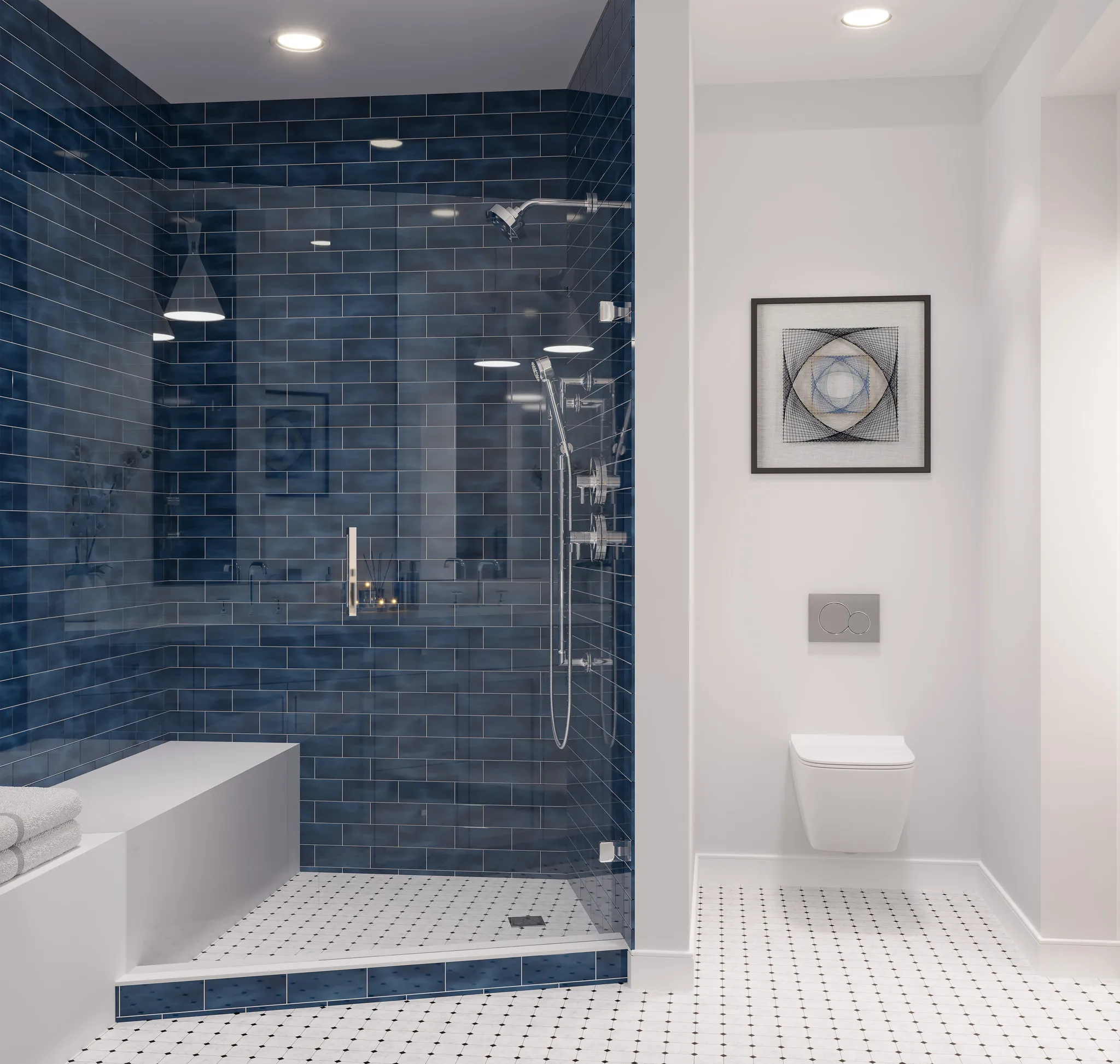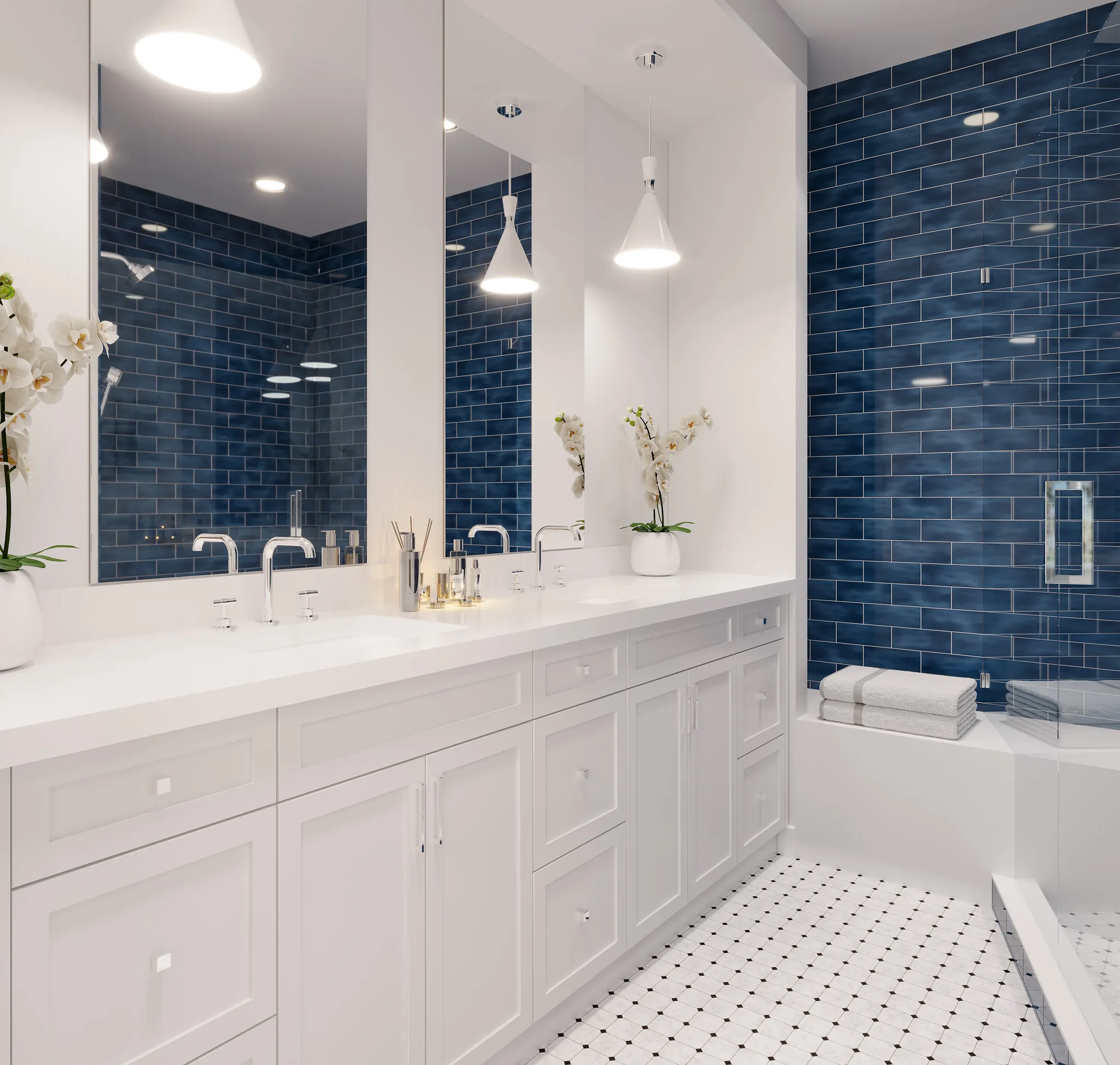 Renova combined modern elegance with timeless design in this luxurious bathroom. Featuring deep navy tile accents, sleek white cabinetry, and high-end fixtures, the space exudes sophistication and spa-like tranquility.