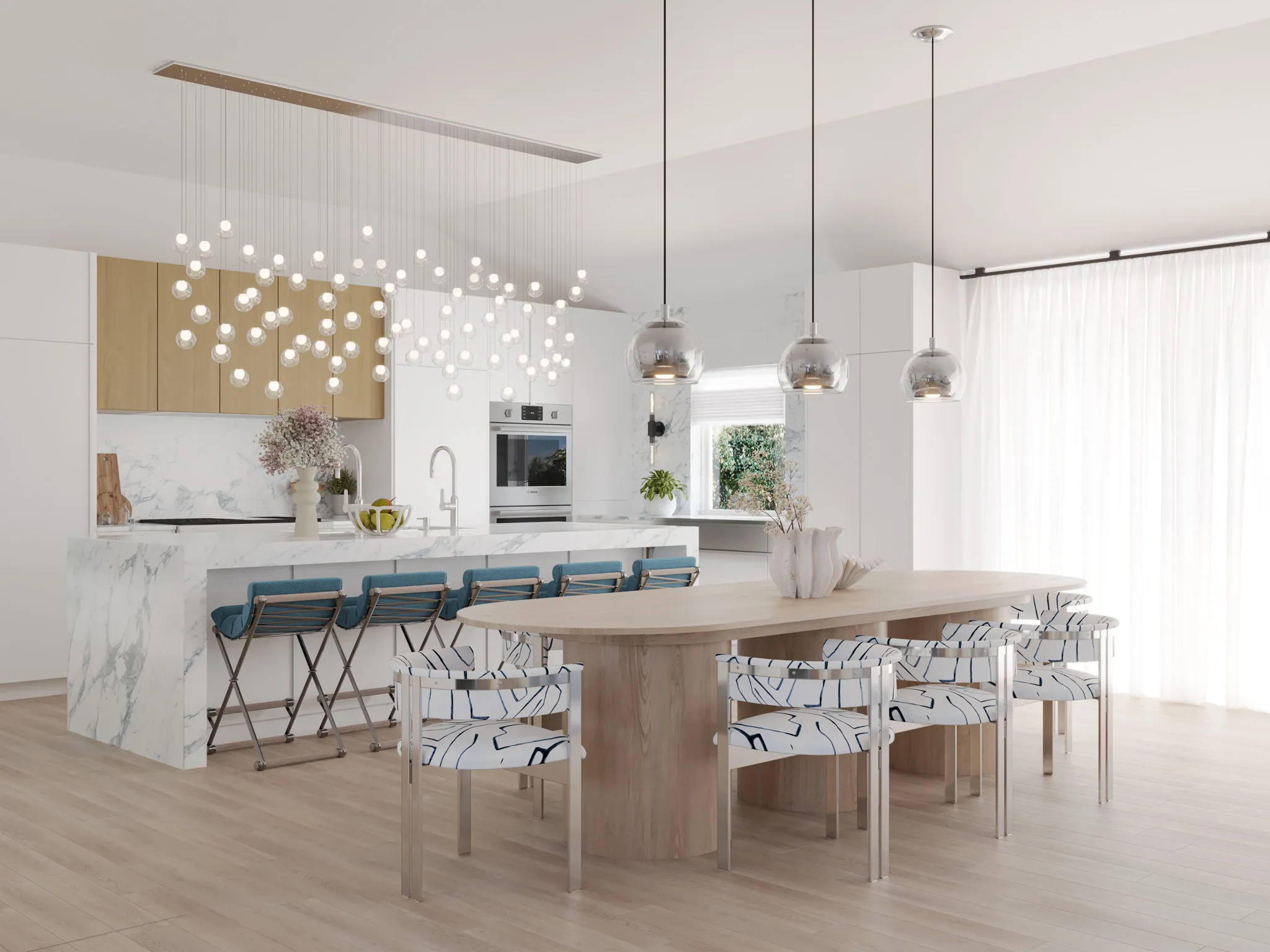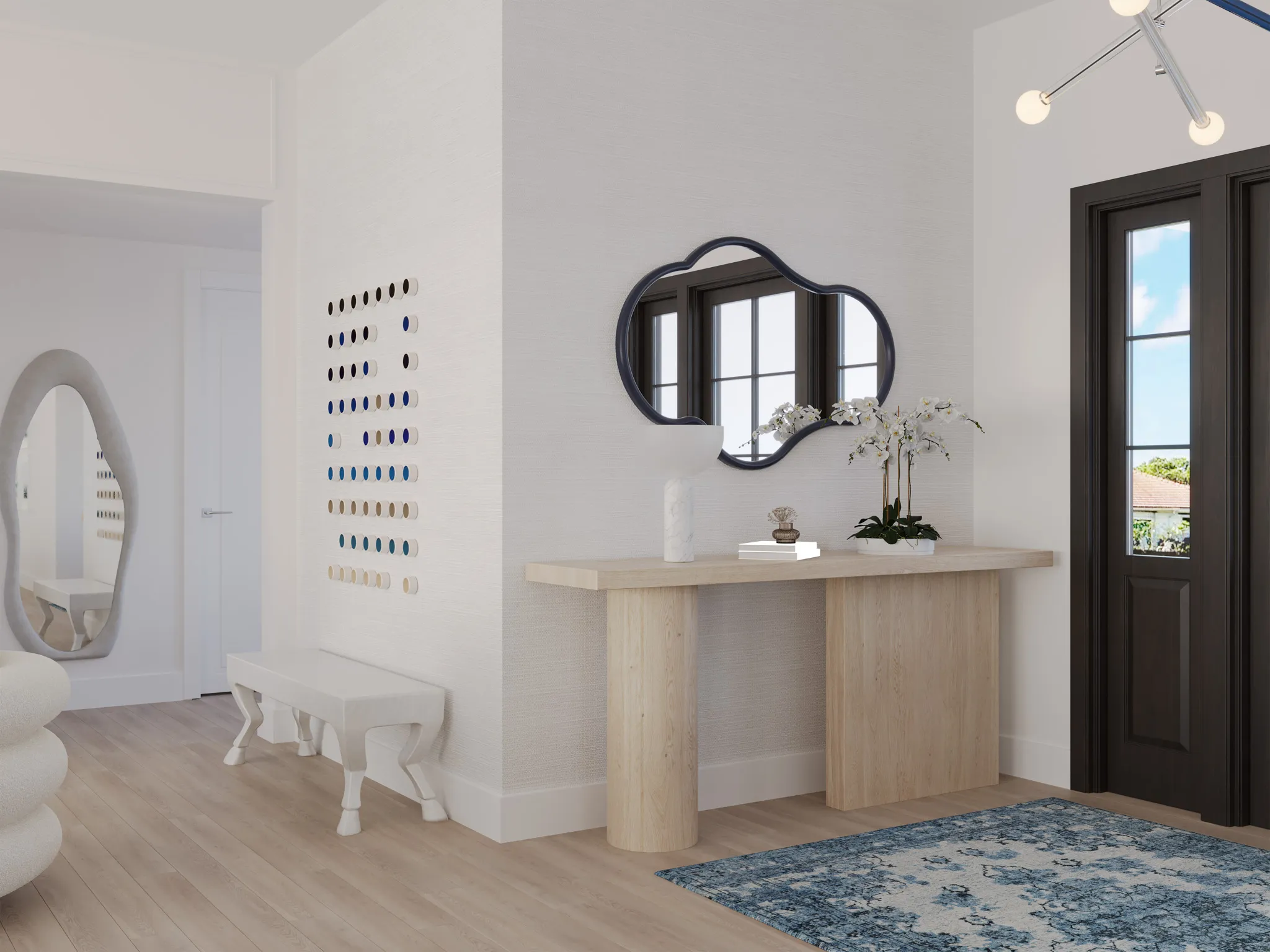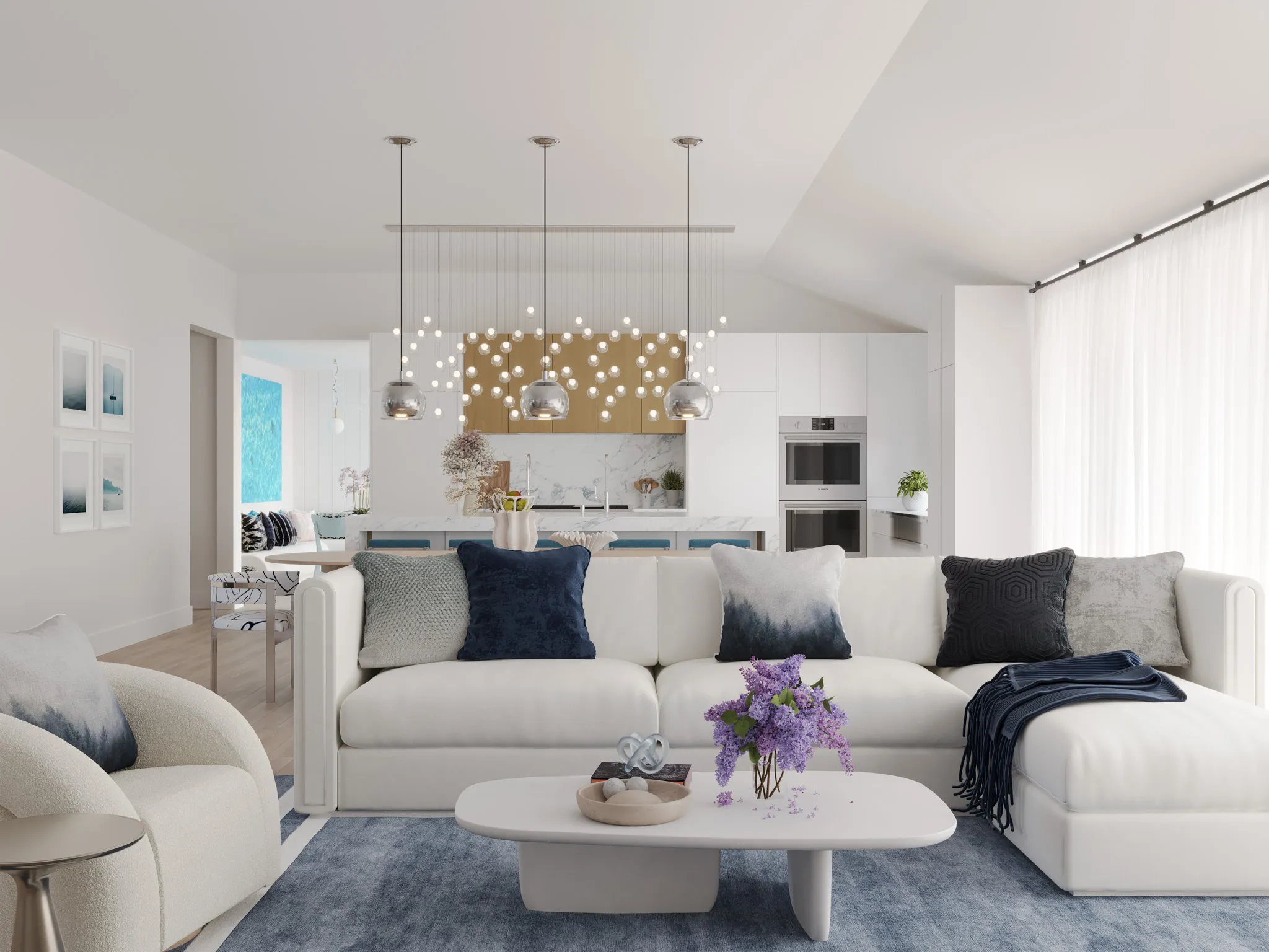 The home opens into a bright, layered living space where white oak floors and textured walls set a serene foundation. Deep navy tones ground the design through art, textiles, and custom detailing. Each curve and material shift was chosen to create a sense of welcome and balance.