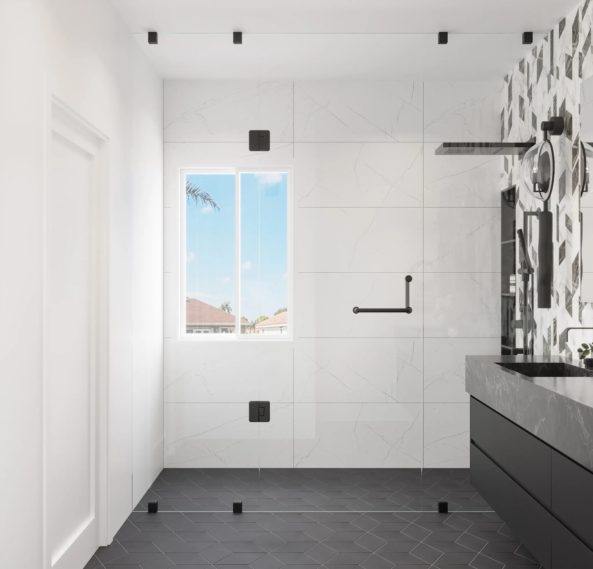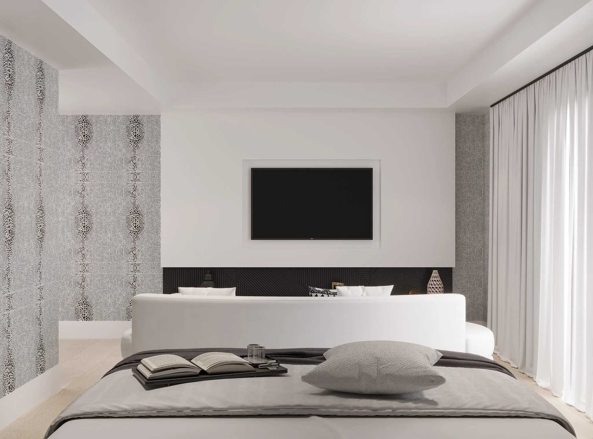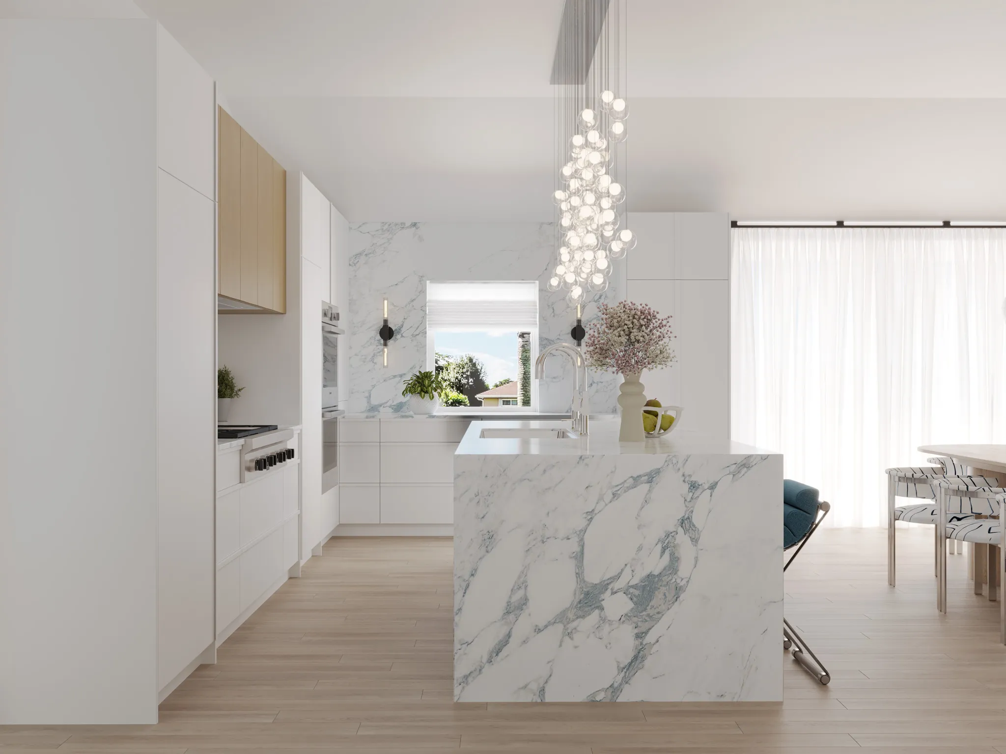 The home opens into a bright, layered living space where white oak floors and textured walls set a serene foundation. Deep navy tones ground the design through art, textiles, and custom detailing. Each curve and material shift was chosen to create a sense of welcome and balance.