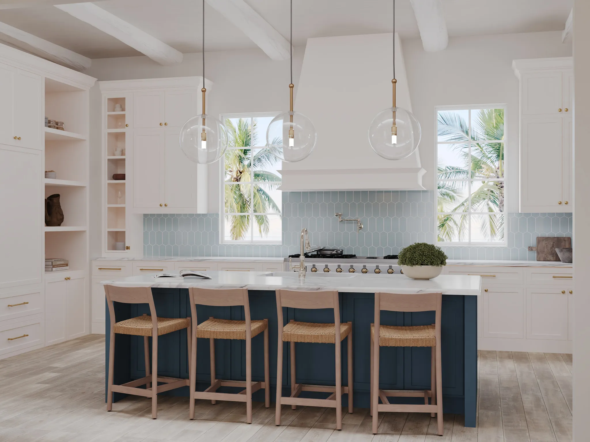 The beamed ceiling and abundant natural light create an inviting atmosphere perfect for seaside living.