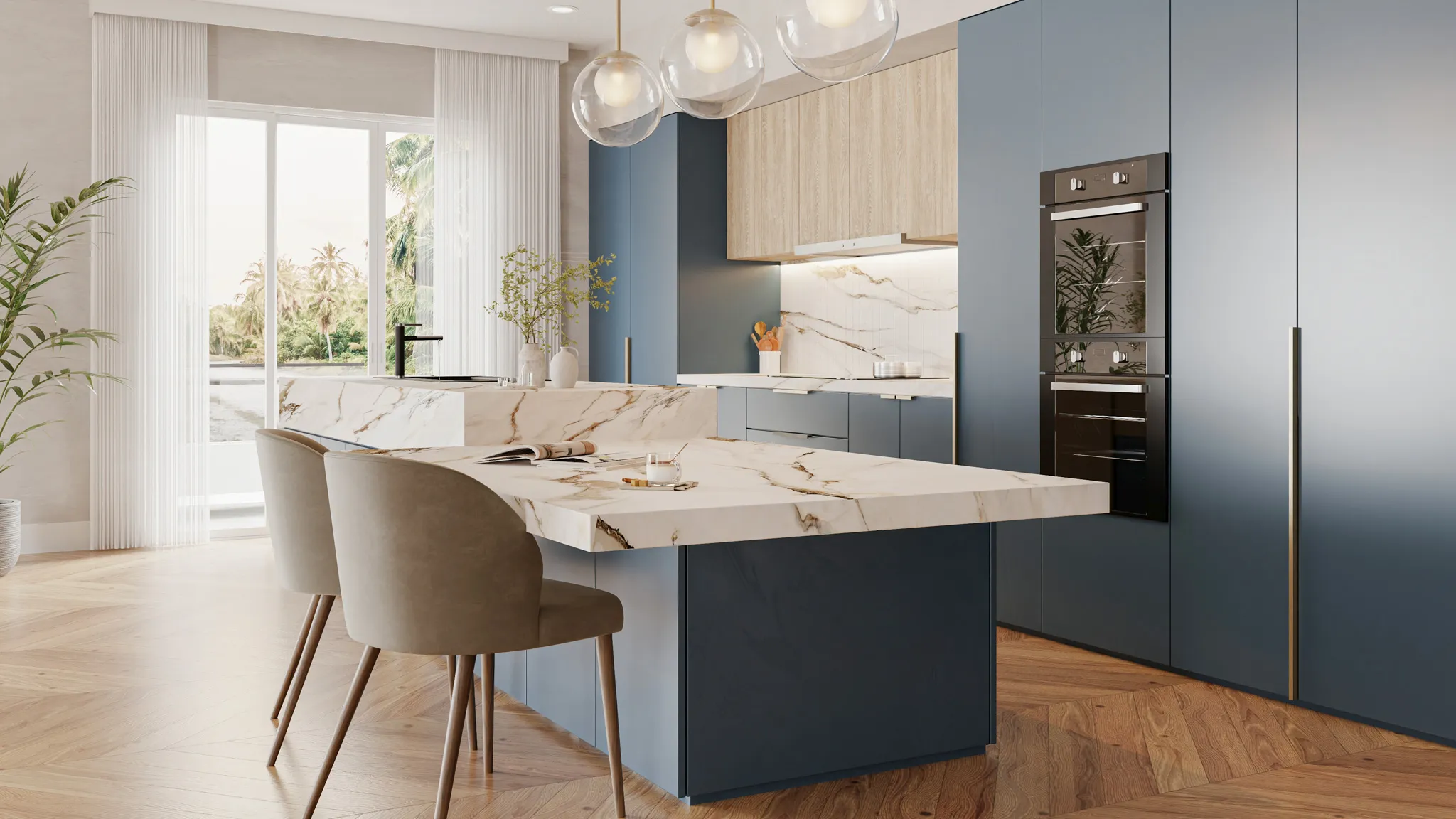 Matte navy cabinetry pairs with white oak and veined porcelain, striking a balance between contrast and warmth. The colors shift throughout the day, reflecting the tones of the nearby coast.