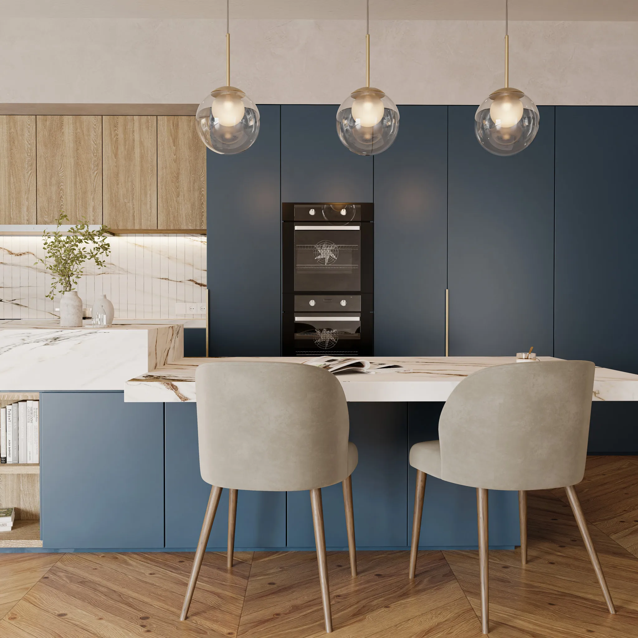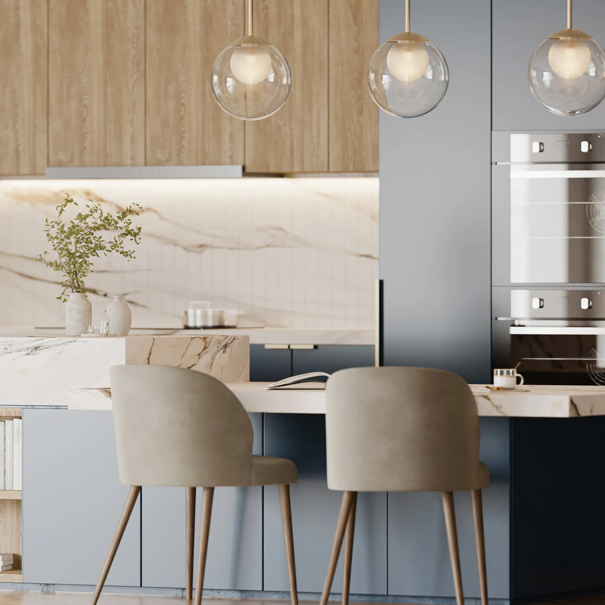 Spherical glass pendants soften the clean lines of the kitchen. Brass accents add quiet sophistication and catch light beautifully without overpowering the room.