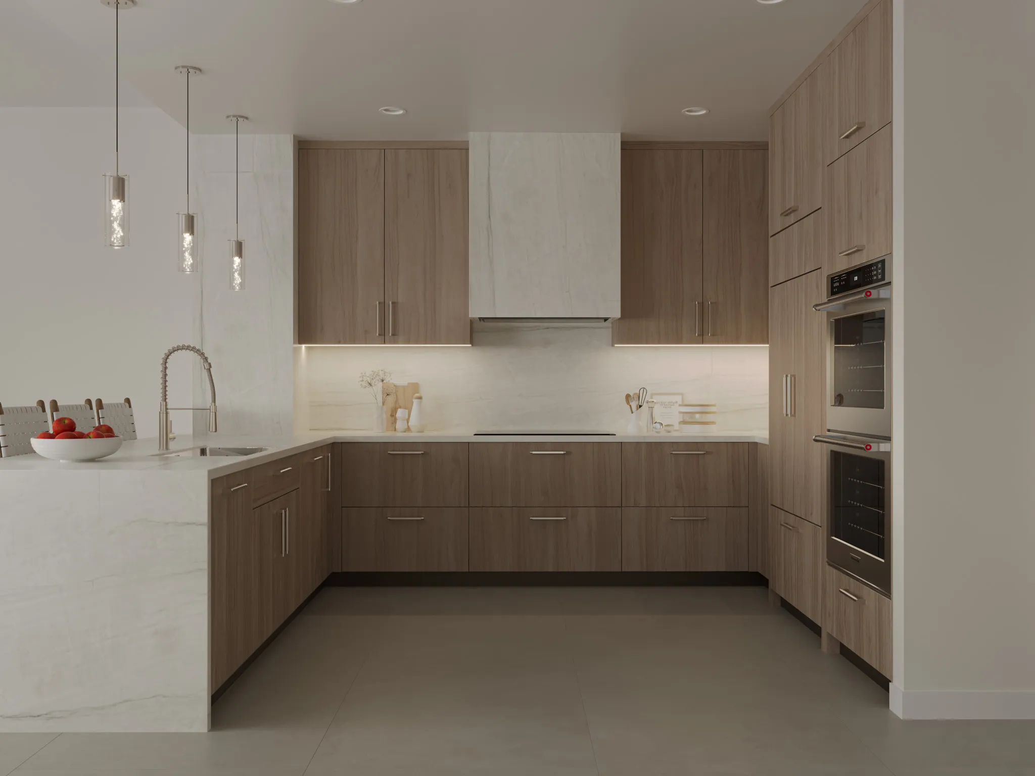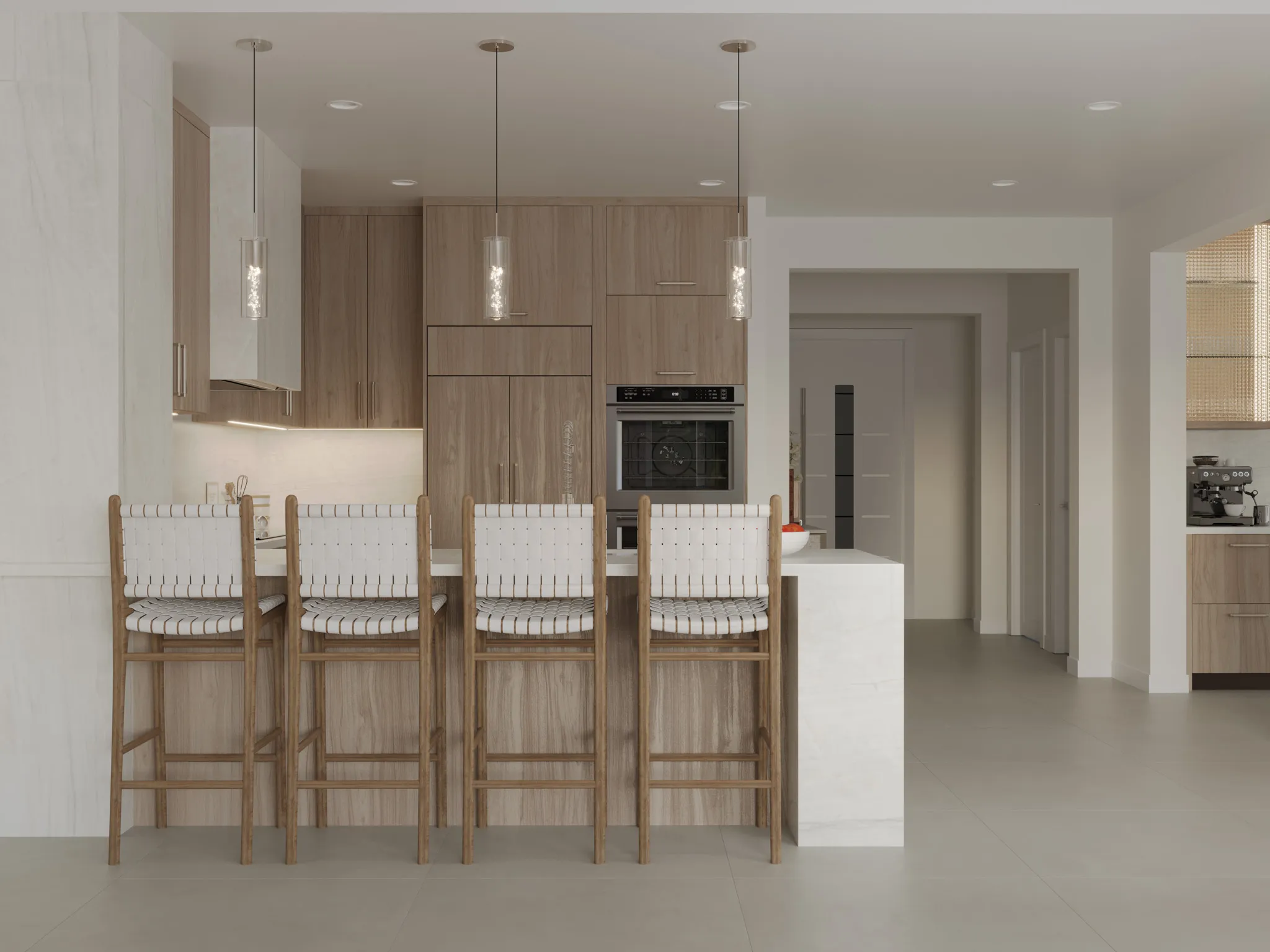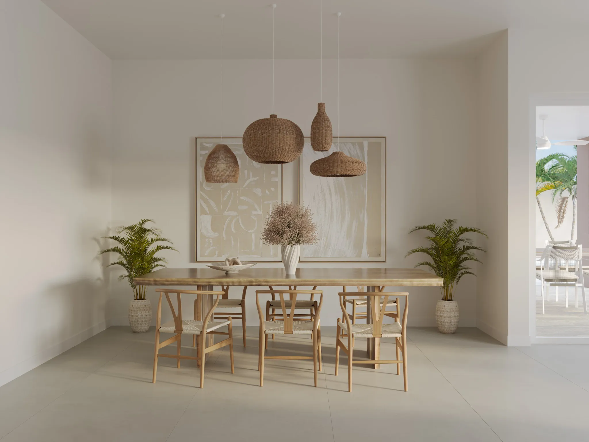 Designed for effortless gatherings, the dining room features natural wood finishes, woven pendant lighting, and tropical greenery that bring warmth and texture to the minimalist design.