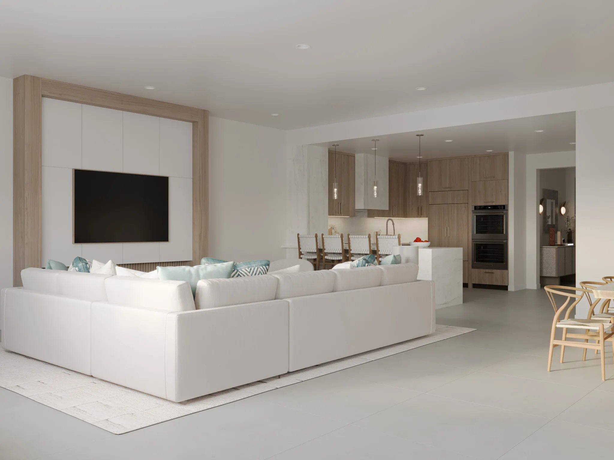 Its open flow to the outdoor space enhances the bright, airy ambiance that defines coastal elegance.