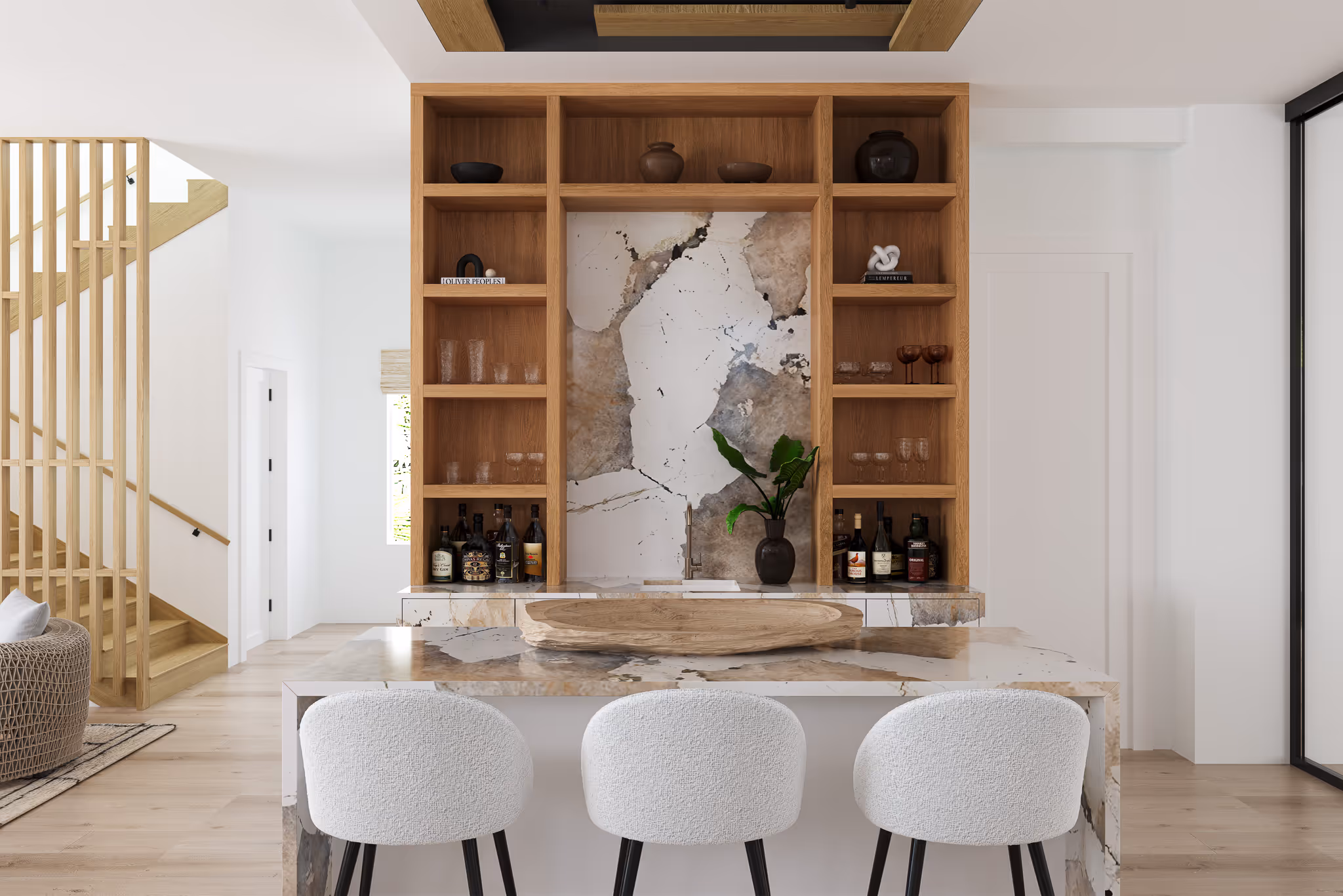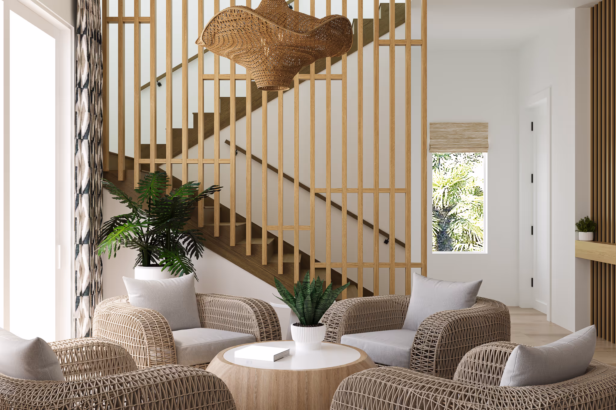 A cozy lounge corner at the base of the stairs offers an intimate space for conversation surrounded by natural textures. Vertical wood slats and woven furniture bring warmth and rhythm to the airy coastal palette.