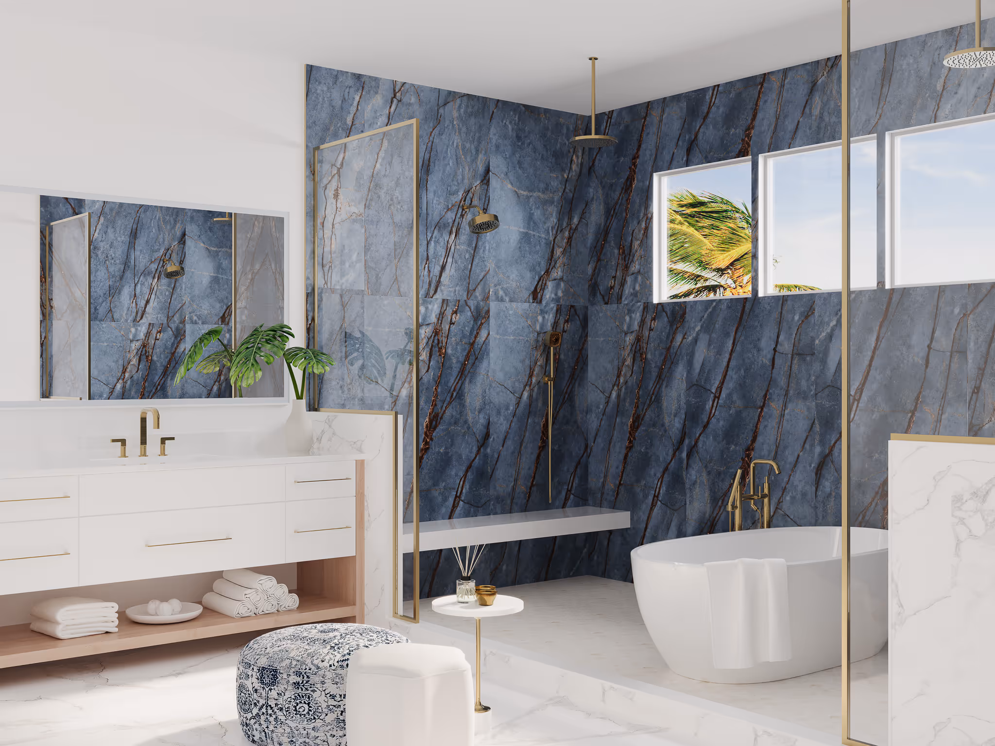 A spa-like retreat framed in striking veined marble and gold accents. The double walk-in showers and freestanding tub are surrounded by natural light, blending luxury with calm simplicity.