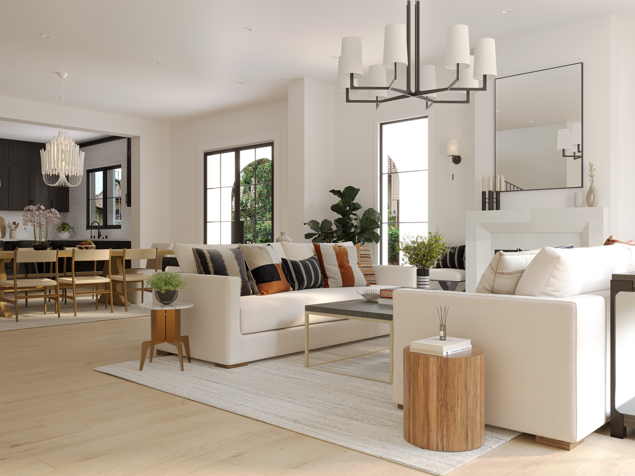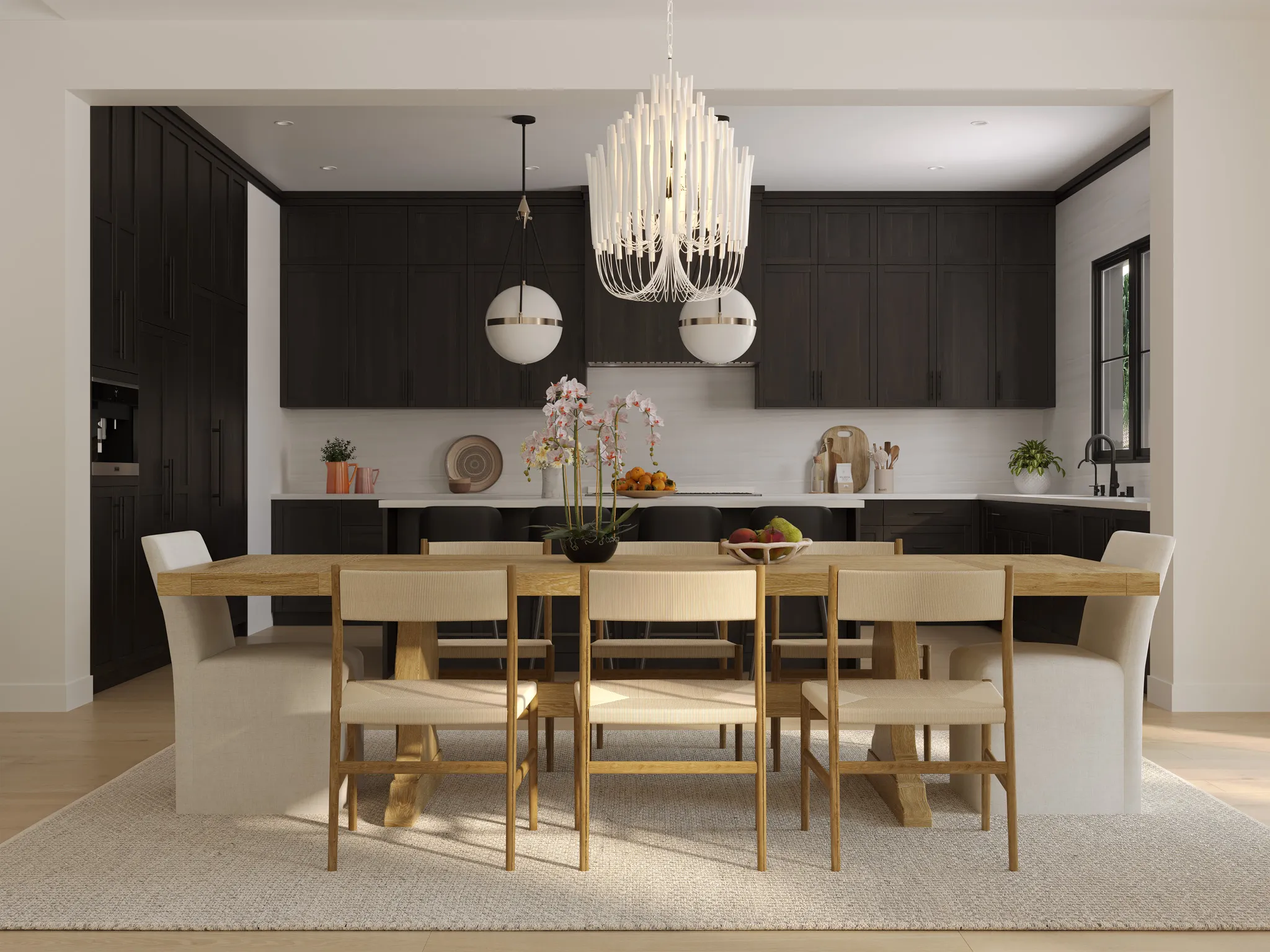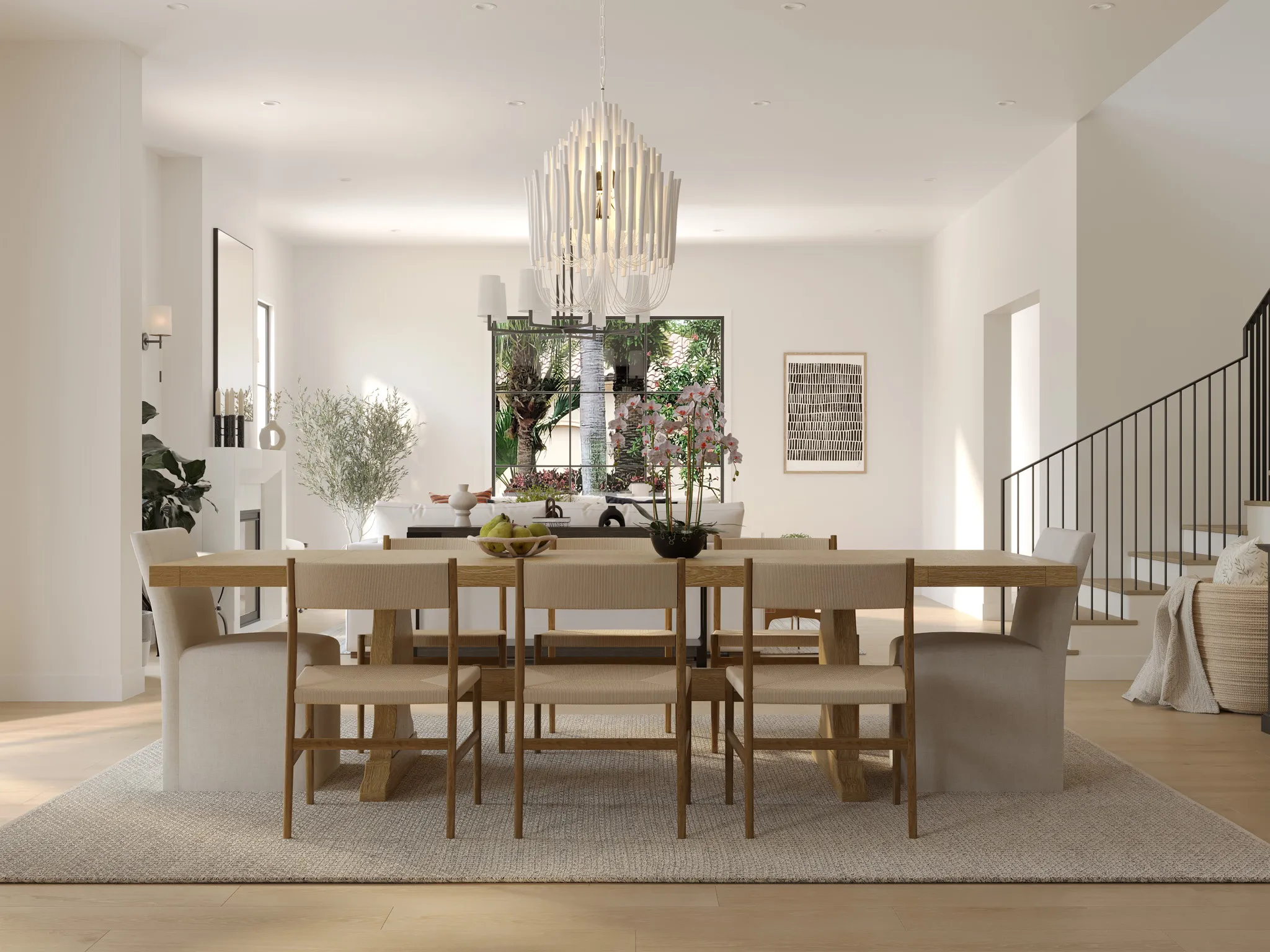 Open and elegant, the dining area unites functionality with warmth through its solid oak table, soft upholstered seating, and a sculptural chandelier that anchors the space in understated luxury.